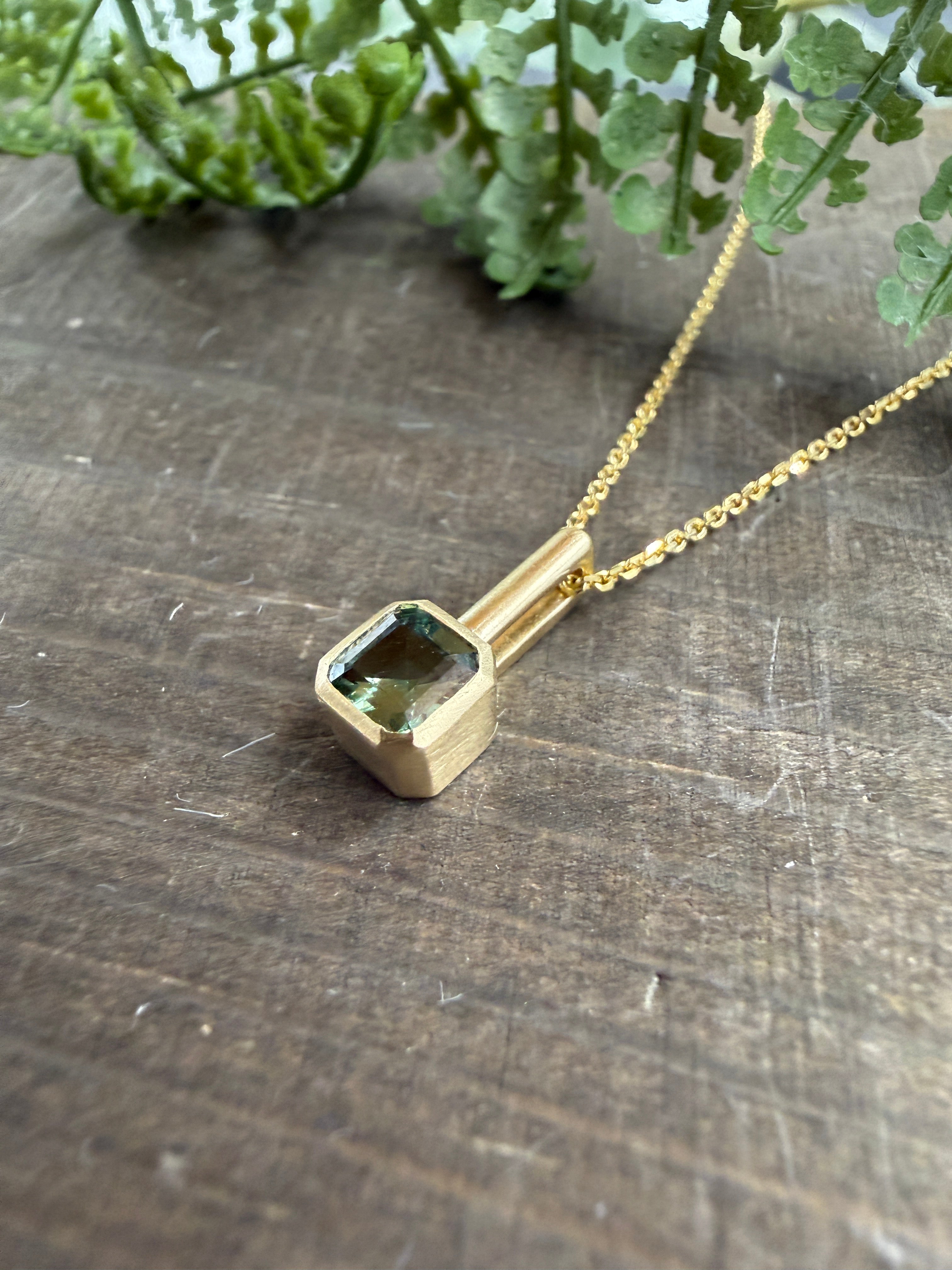 A simple and elegant piece, this pendant features a 0.60ct asscher cut teal sapphire that has been bezel set in brushed 14k yellow gold. This pendant hangs approximately half an inch off of a 14k yellow gold 16" chain.
