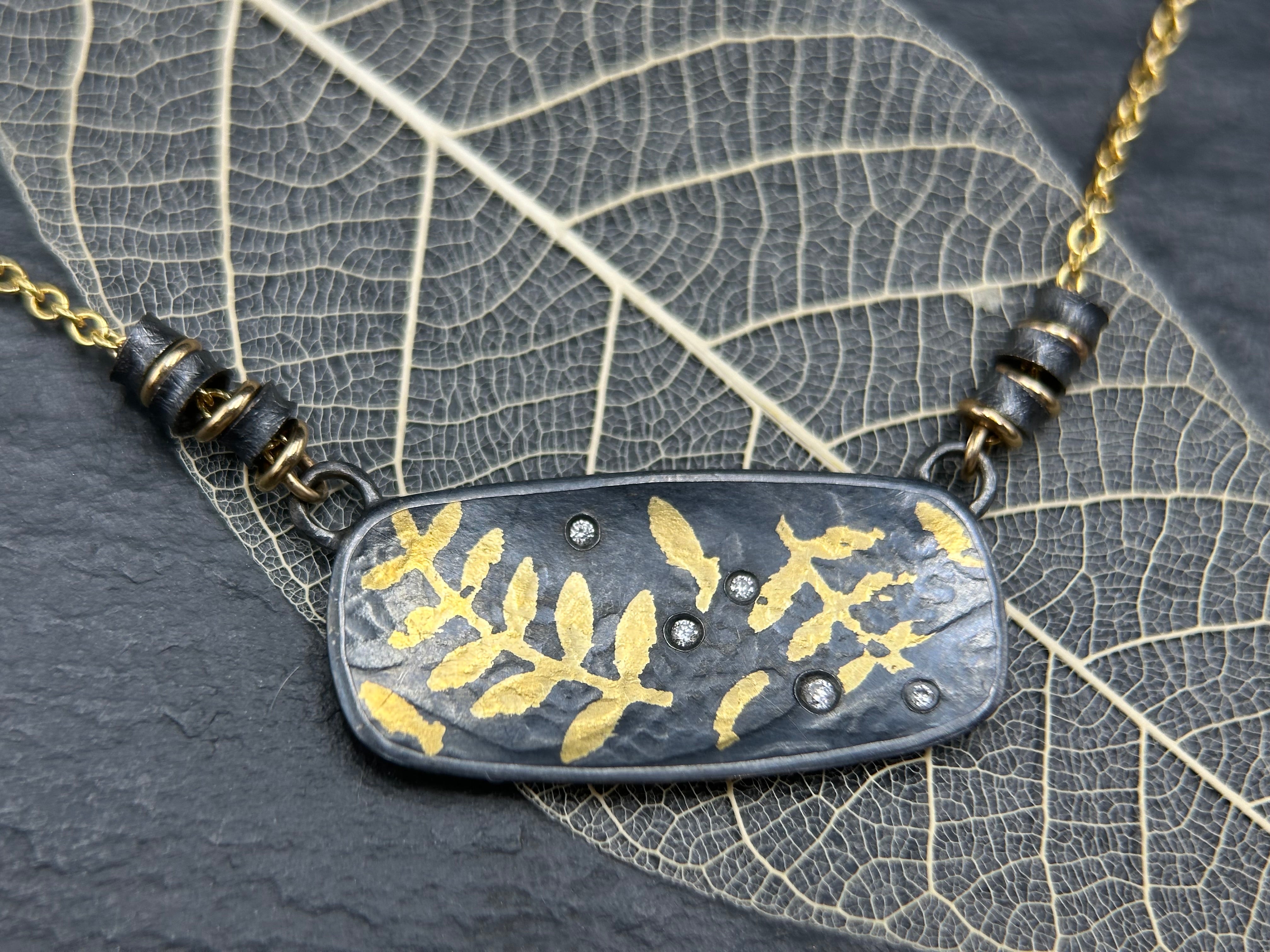 This stunning necklace features an oxidized silver design complemented by 24k gold accents, showcasing a unique leafy pattern. The 24k yellow gold keum boo technique further enhances this elegant design. Five small white diamonds of varying sizes are organically scattered throughout the pendant, adding extra sparkle and visual interest.