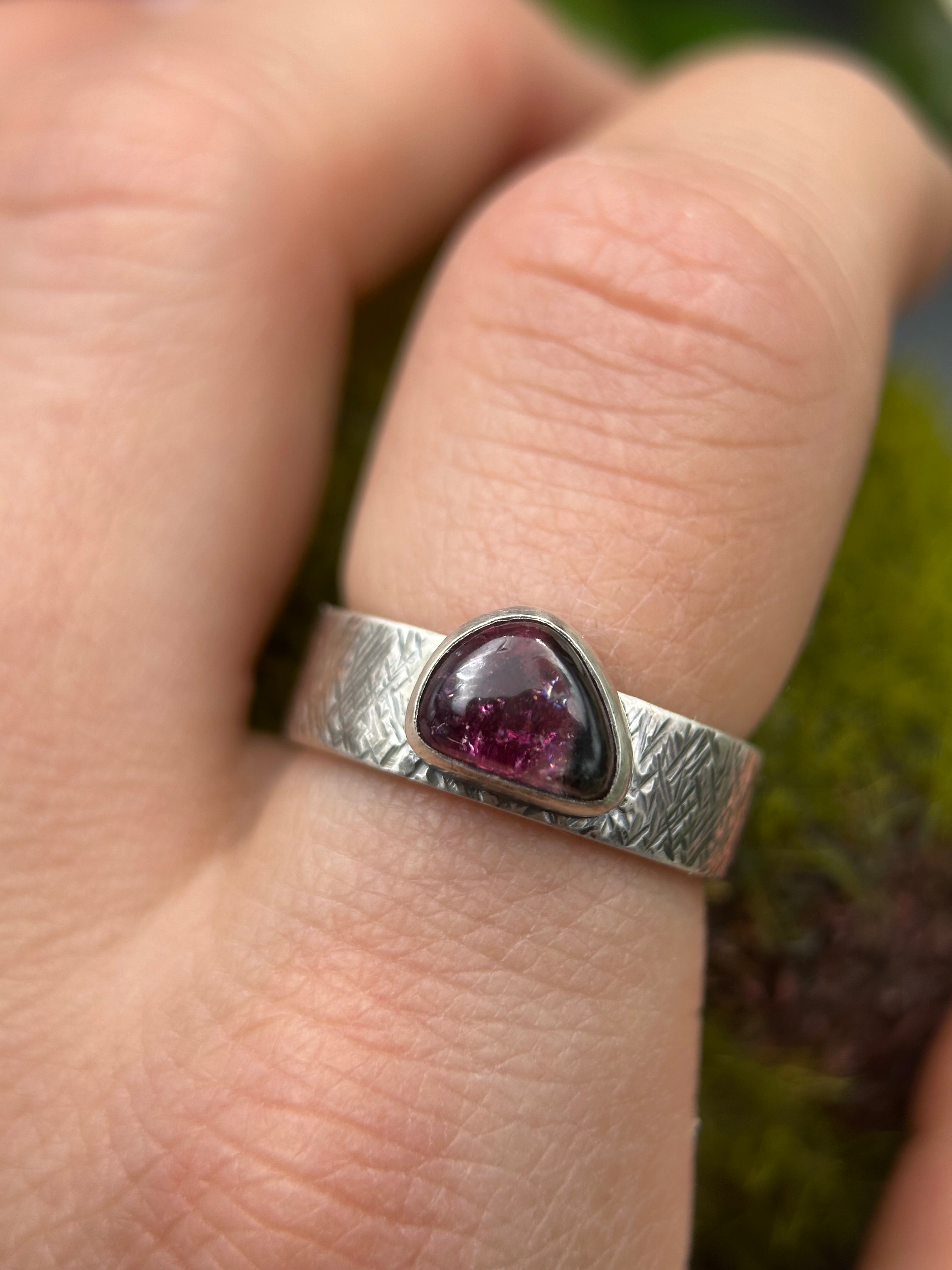 This asymmetrically-shaped pink and green tourmaline cabochon is bezel-set, offset on a sterling silver band with an organic cross-hatched texture and an oxidized, matte finish.