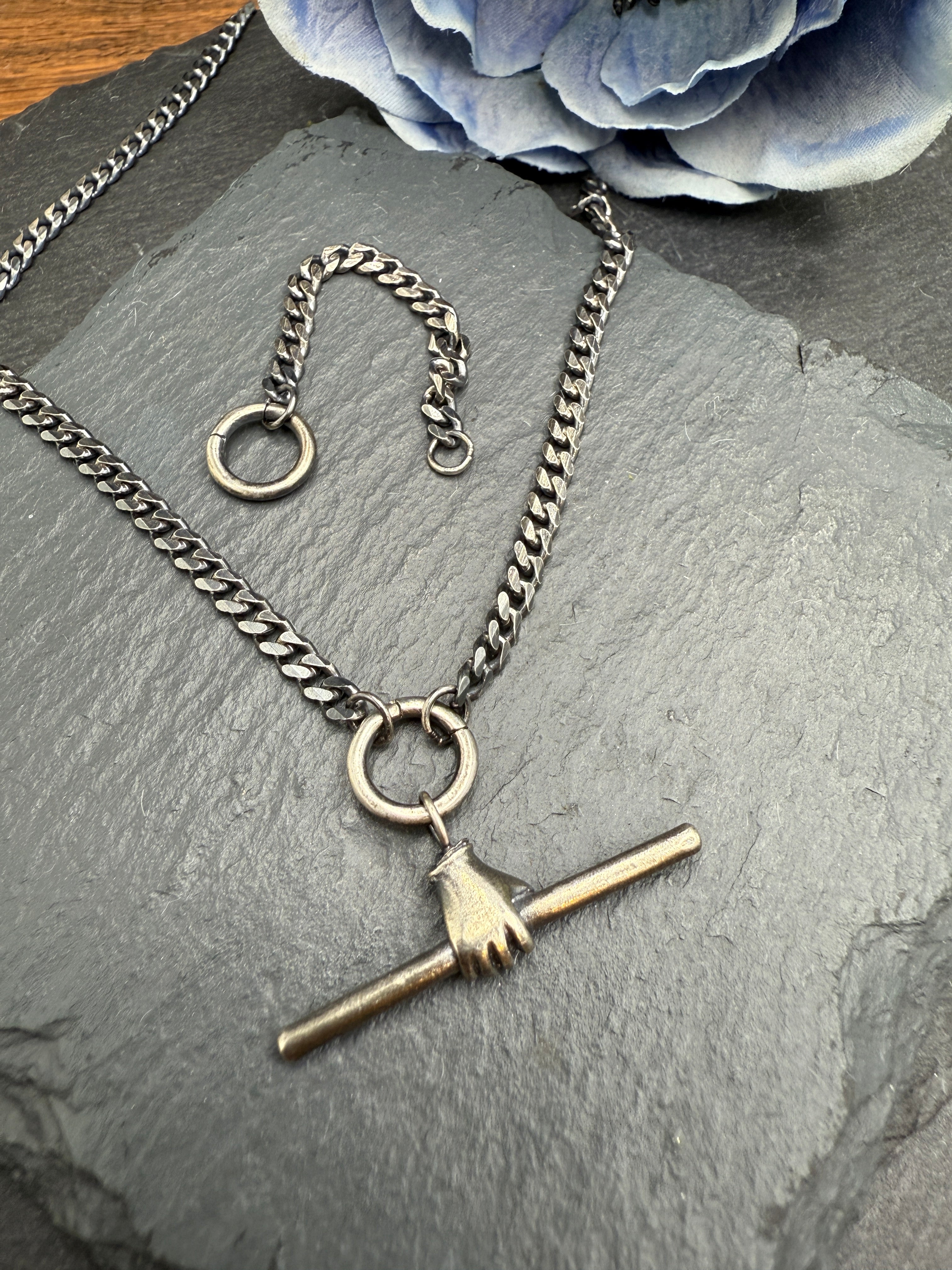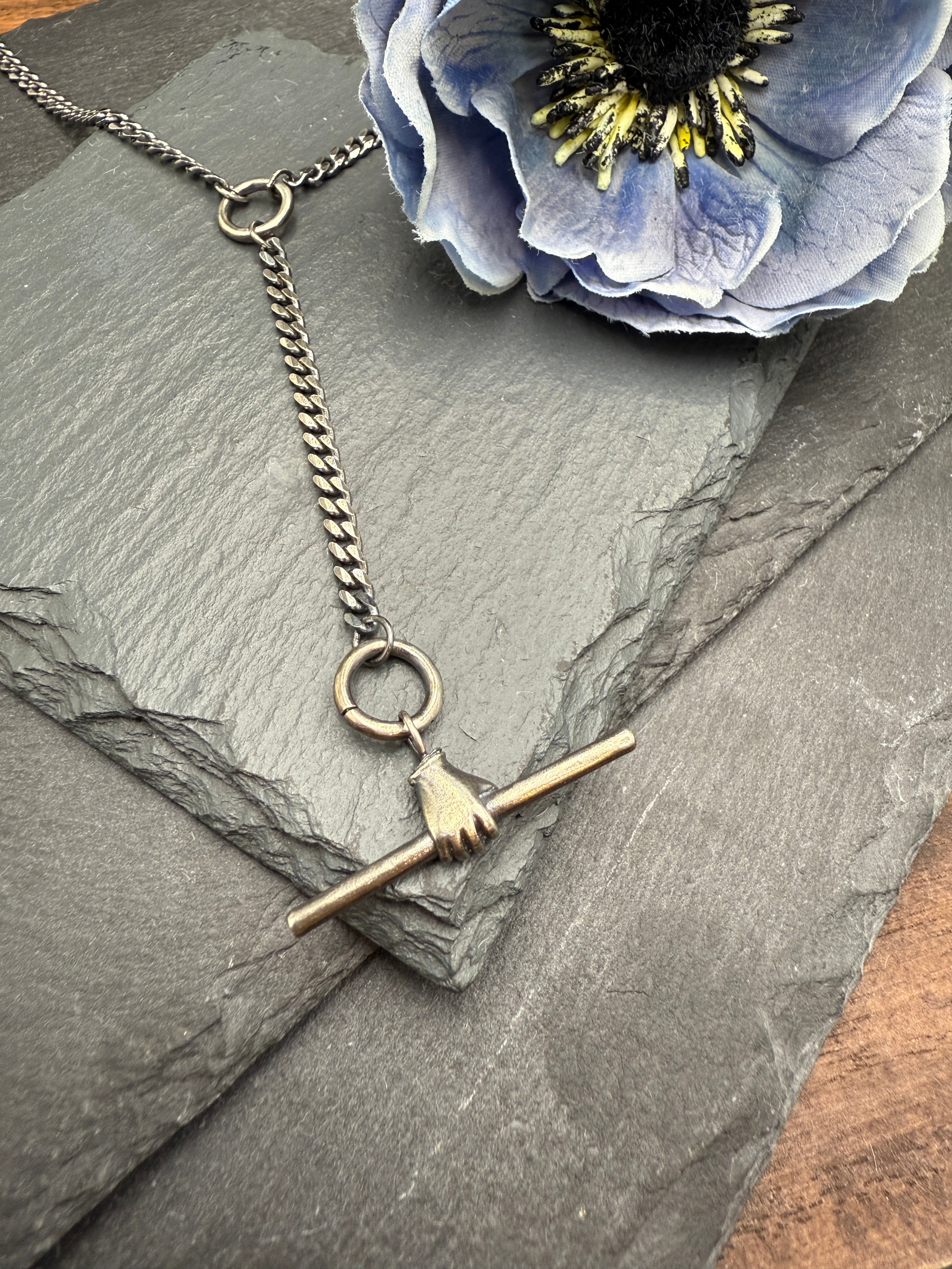 This eye-catching charm holder necklace features a beautiful oxidized silver curb chain, with a grasping hand toggle at the end. This charm holder is versatile is length and design, with adjustable lengths at 24" and 22" with the toggle attached, and 19" and 17" without the toggle. Charms can be added to either jump rings. Charms sold separately. Handmade in Minnesota, USA.