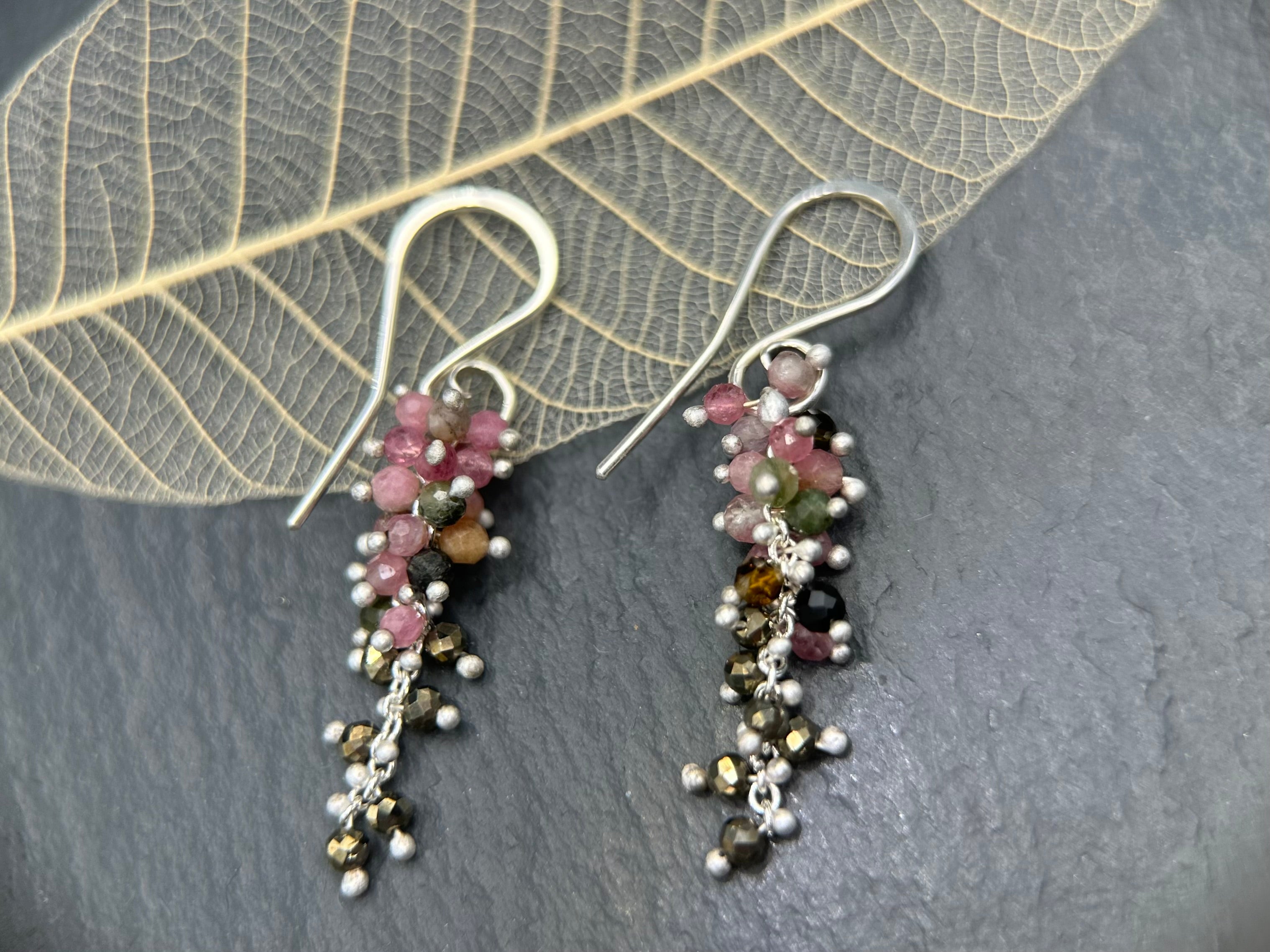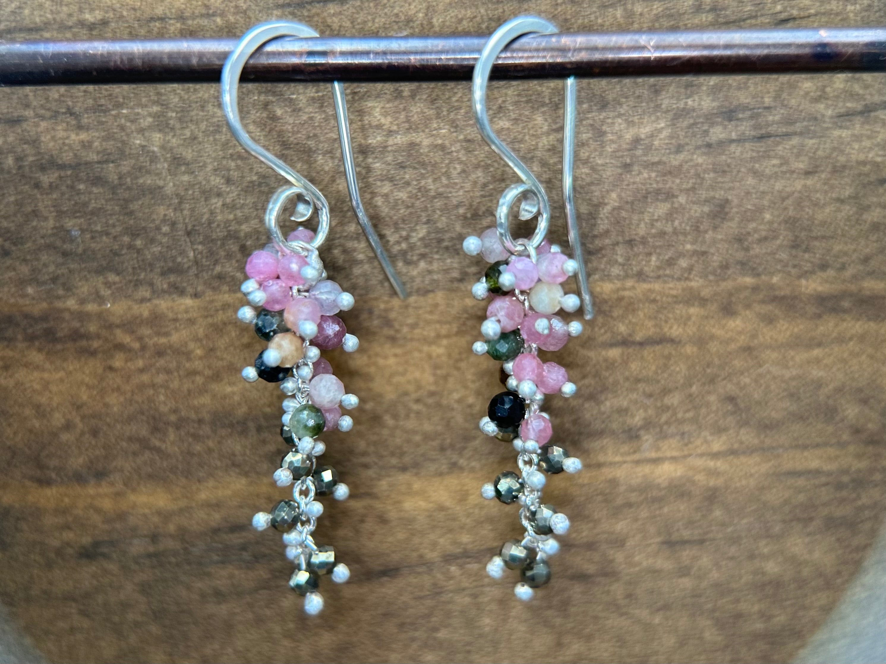 A mix of twinkling tourmaline and pyrite beads are held on a sterling silver chain with sterling silver bead accents. These earrings are just over 1.5 inches in length and hang on gold-filled ear wires.