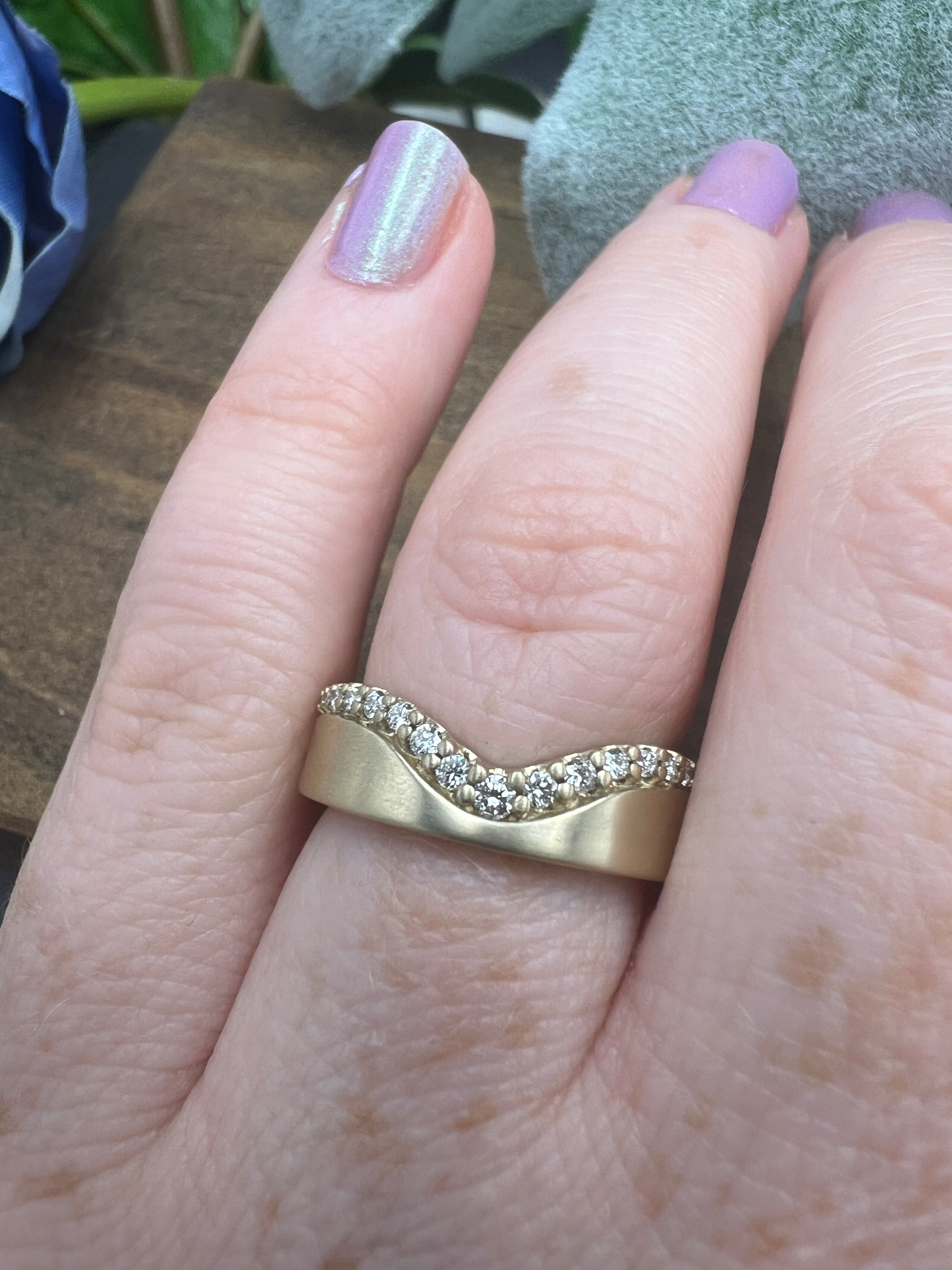 A unique wide band with a little curve to it and sparkly diamond details. Looks great on its own, and would stack nicely with other rings too. 14K yellow gold with .20ctw of diamonds. The band measures 6.5mm at its widest point and tapers to 4mm at the "V." Currently a size 7, and can be resized.
