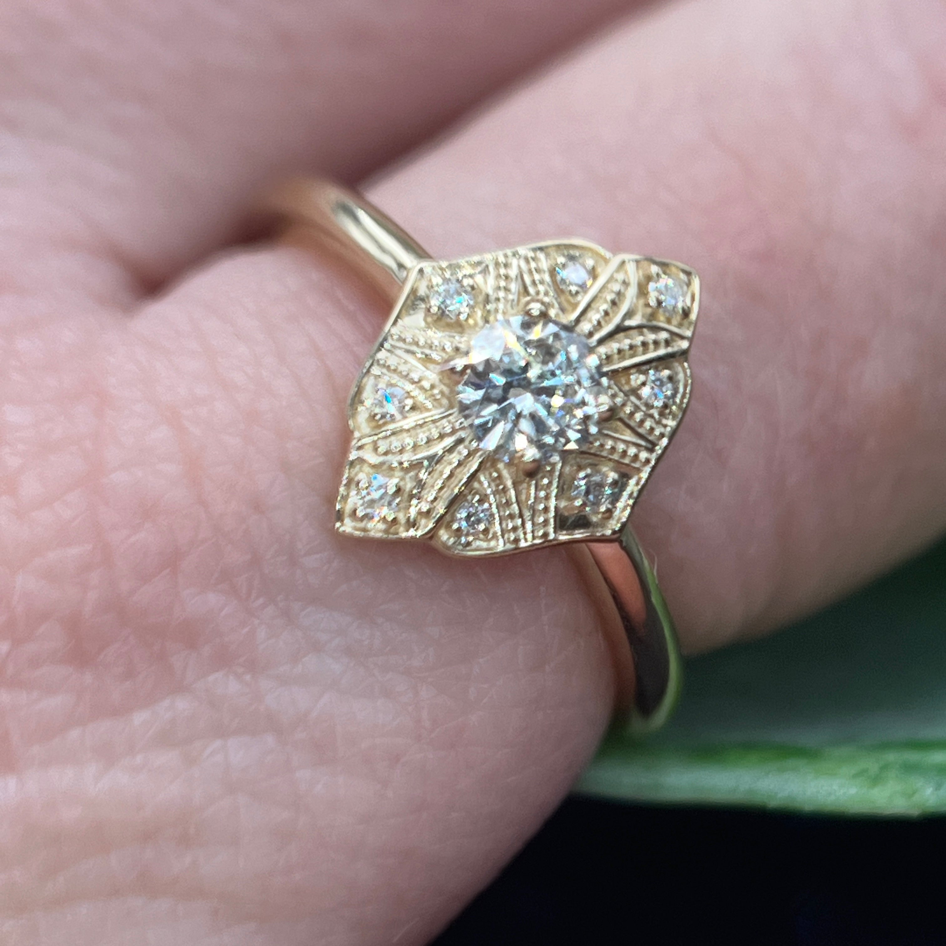 Reminiscent of deco designs, this 14k yellow gold ring marries old and new vibes. Set with natural diamonds, the center diamond weighs 0.25ct, I-J, VS for color and clarity. Eight small round natural diamonds are scattered around the center diamond, weighing 0.05ctw, GH, SI1 for color and clarity. This ring is a size 6.75 and can be sized.